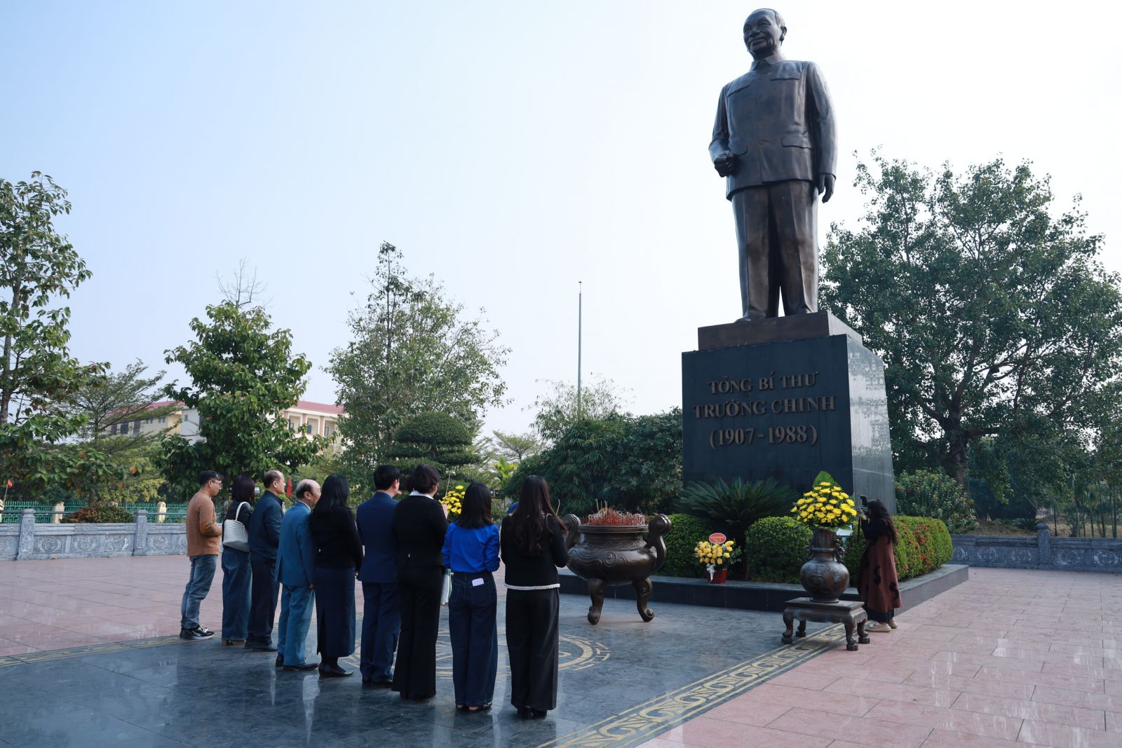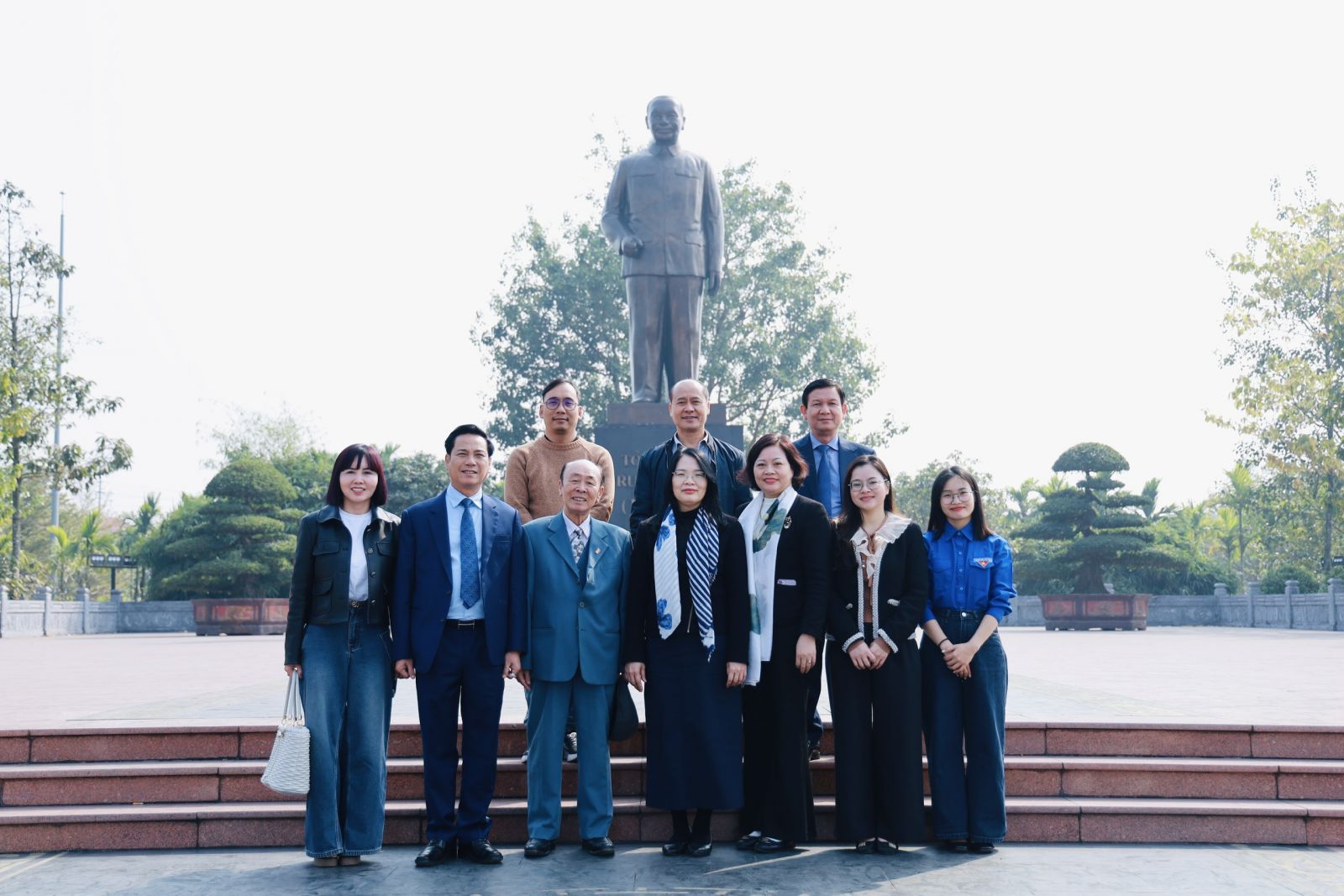 Đoàn công tác Nhà xuất bản Chính trị quốc gia Sự thật chụp ảnh lưu niệm tại Tượng đài Tổng Bí thư Trường Chinh (xã Xuân Trường, tỉnh Ninh Bình).