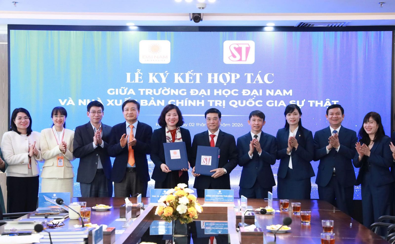 Chiều 2/2/2026, tại Hà Nội, Nhà xuất bản Chính trị quốc gia Sự thật và Trường Đại học Đại Nam đã tổ chức Lễ ký kết hợp tác giai đoạn 2026 - 2030. Đồng chí Nguyễn Thái Bình, Phó Giám đốc Nhà xuất bản Chính trị quốc gia Sự thật và TS. Lê Đắc Sơn, Chủ tịch Hội đồng trường Trường Đại học Đại Nam chủ trì buổi lễ.