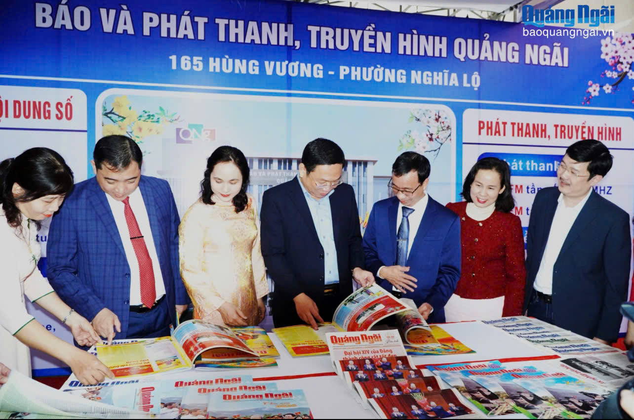 Lãnh đạo tỉnh Quảng Ngãi và các đại biểu tham quan gian trưng bày ấn phẩm báo chí của Báo và Phát thanh, Truyền hình Quảng Ngãi.