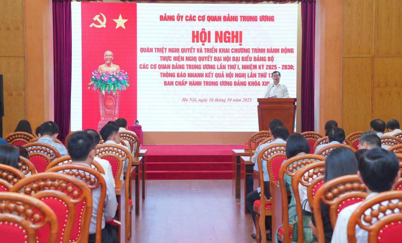 Chiều 16/10/2025, tại Hà Nội, Đảng ủy các cơ quan Đảng Trung ương đã tổ chức Hội nghị quán triệt Nghị quyết và triển khai Chương trình hành động thực hiện Nghị quyết Đại hội đại biểu Đảng bộ các cơ quan Đảng Trung ương lần thứ I, nhiệm kỳ 2025 - 2030; thông báo nhanh kết quả Hội nghị lần thứ 13 Ban Chấp hành Trung ương Đảng khóa XIII. Hội nghị được kết nối trực tuyến từ điểm cầu chính tại Ban Tuyên giáo và Dân vận Trung ương tới các điểm cầu trong toàn Đảng bộ.