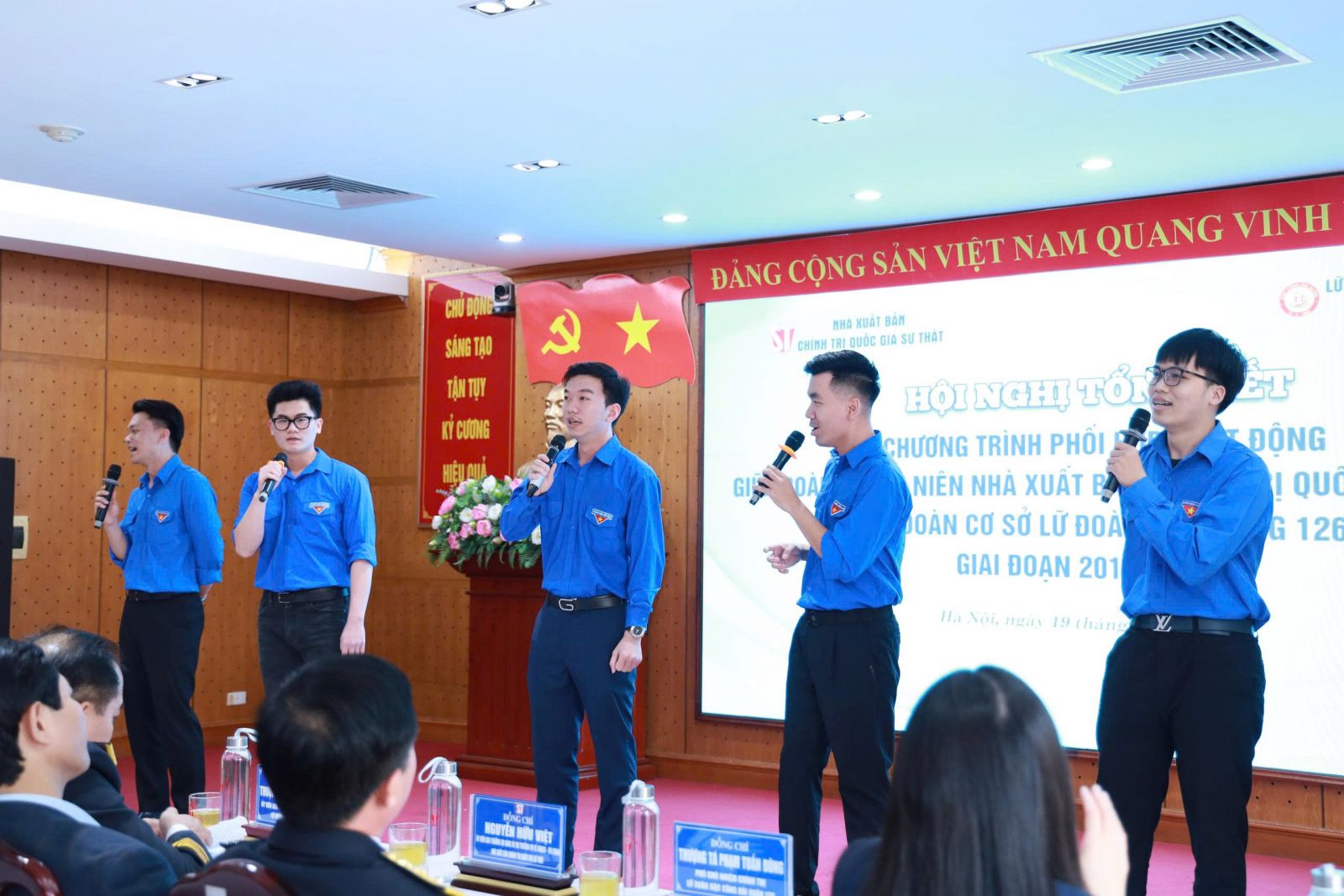 Về phía Nhà xuất bản Chính trị quốc gia Sự thật có các đồng chí: Nguyễn Hoài Anh, Ủy viên Ban Thường vụ Đảng ủy, Phó Giám đốc - Phó Tổng Biên tập; Nguyễn Hữu Việt, Ủy viên Ban Thường vụ Đảng ủy phụ trách công tác thanh niên, Vụ trưởng Vụ Kế hoạch - Tài chính; Đặng Đức Chiến, Ủy viên Ban Chấp hành Đảng bộ, Chánh Văn phòng; Phạm Tuyết Nhung, Ủy viên Ban Chấp hành Đảng bộ, Phó Chánh Văn phòng; Nguyễn Thị Kim Thoa, Bí thư Đoàn Thanh niên Nhà xuất bản, cùng cán bộ, đoàn viên thanh niên đang công tác tại Hà Nội.