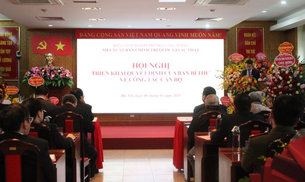 Tại Hội nghị, thừa ủy quyền của Trưởng Ban Tổ chức Trung ương, đồng chí Bùi Huy Thành, Phó Vụ Trưởng Vụ V, Ban Tổ chức Trung ương công bố các quyết định của Ban Bí thư Trung ương Đảng: Quyết định nghỉ hưu đối với đồng chí Phạm Chí Thành, Quyền Giám đốc - Tổng Biên tập Nhà xuất bản Chính trị quốc gia Sự thật; Quyết định bổ nhiệm đồng chí Phạm Minh Tuấn, Giám đốc Học viện Chính trị Khu vực II, Học viện Chính trị quốc gia Hồ Chí Minh giữ chức Giám đốc - Tổng Biên tập Nhà xuất bản Chính trị quốc gia Sự thật.