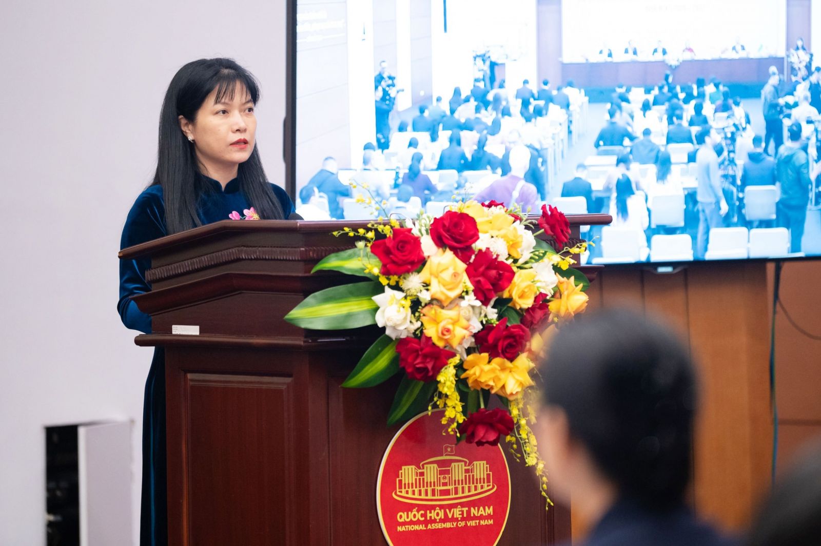 Đồng chí Tạ Thị Yên, Phó Chủ nhiệm Ủy ban Công tác đại biểu, Phó Chánh Văn phòng Thường trực Văn phòng Hội đồng Bầu cử quốc gia, Ủy viên Tiểu ban Nhân sự thuộc Hội đồng Bầu cử quốc gia phát biểu tại buổi họp báo.