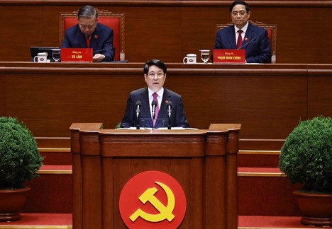 Tổng Bí thư Tô Lâm trình bày Báo cáo của Ban Chấp hành Trung ương Đảng khóa XIII về các văn kiện trình Đại hội XIV của Đảng. Ảnh: TTXVN