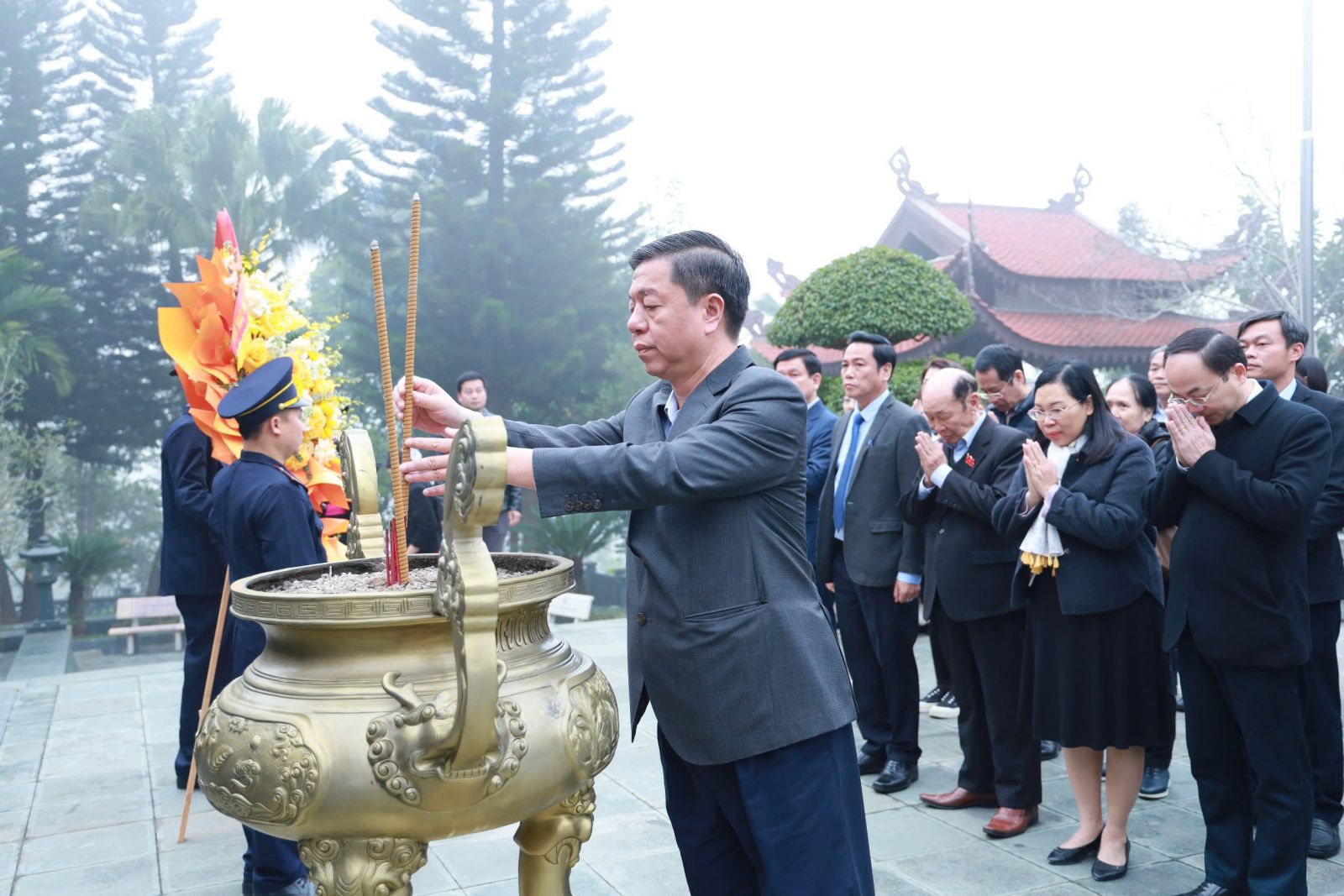PGS. TS. Vũ Trọng Lâm, Giám đốc - Tổng Biên tập Nhà xuất bản Chính trị quốc gia Sự thật dâng hương tưởng niệm Chủ tịch Hồ Chí Minh tại Nhà tưởng niệm Người trên đỉnh đèo De, xã Phú Đình, tỉnh Thái Nguyên.
