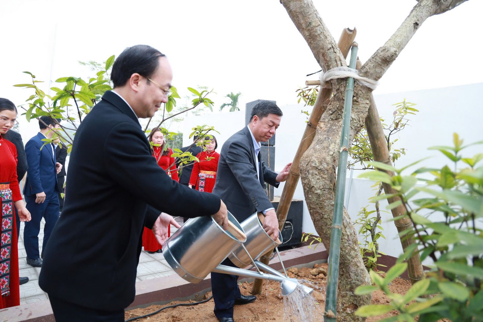 PGS.TS. Vũ Trọng Lâm, Giám đốc - Tổng Biên tập Nhà xuất bản Chính trị quốc gia Sự thật và đồng chí Nguyễn Đăng Bình, Phó Bí thư Thường trực Tỉnh ủy, Chủ tịch Hội đồng nhân dân tỉnh Thái Nguyên trồng cây lưu niệm tại điểm di tích.
