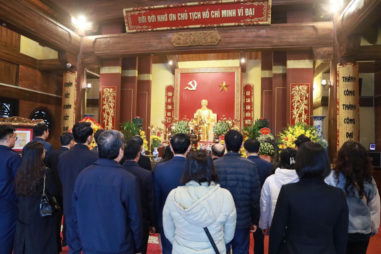 Đoàn đại biểu Nhà xuất bản Chính trị quốc gia Sự thật và tỉnh Thái Nguyên dâng hương tưởng niệm Chủ tịch Hồ Chí Minh tại Nhà tưởng niệm Người trên đỉnh đèo De, xã Phú Đình, tỉnh Thái Nguyên.