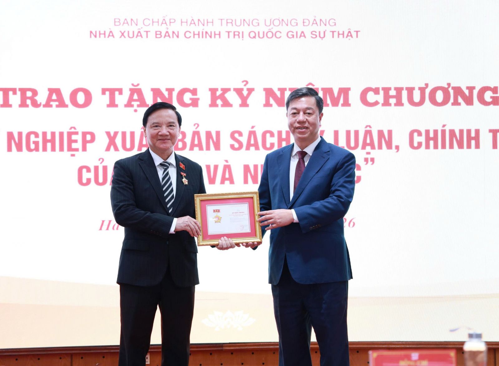 PGS.TS. Vũ Trọng Lâm, Giám đốc - Tổng Biên tập Nhà xuất bản Chính trị quốc gia Sự thật trao tặng đồng chí Nguyễn Khắc Định, Ủy viên Trung ương Đảng, Phó Chủ tịch Quốc hội Kỷ niệm chương “Vì sự nghiệp xuất bản sách lý luận, chính trị của Đảng và Nhà nước”.