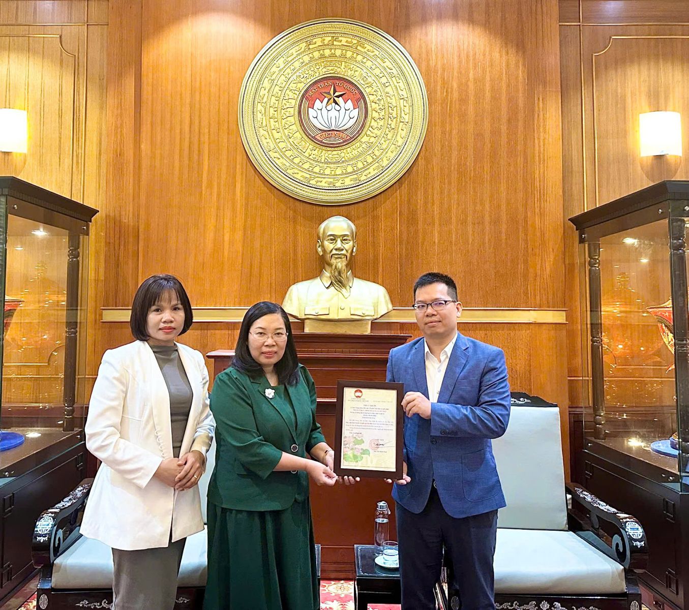 Đồng chí Lê Thanh Tú, Phó Trưởng Ban Công tác xã hội thay mặt Trung ương Mặt trận Tổ quốc Việt Nam trao thư cảm ơn Nhà xuất bản.