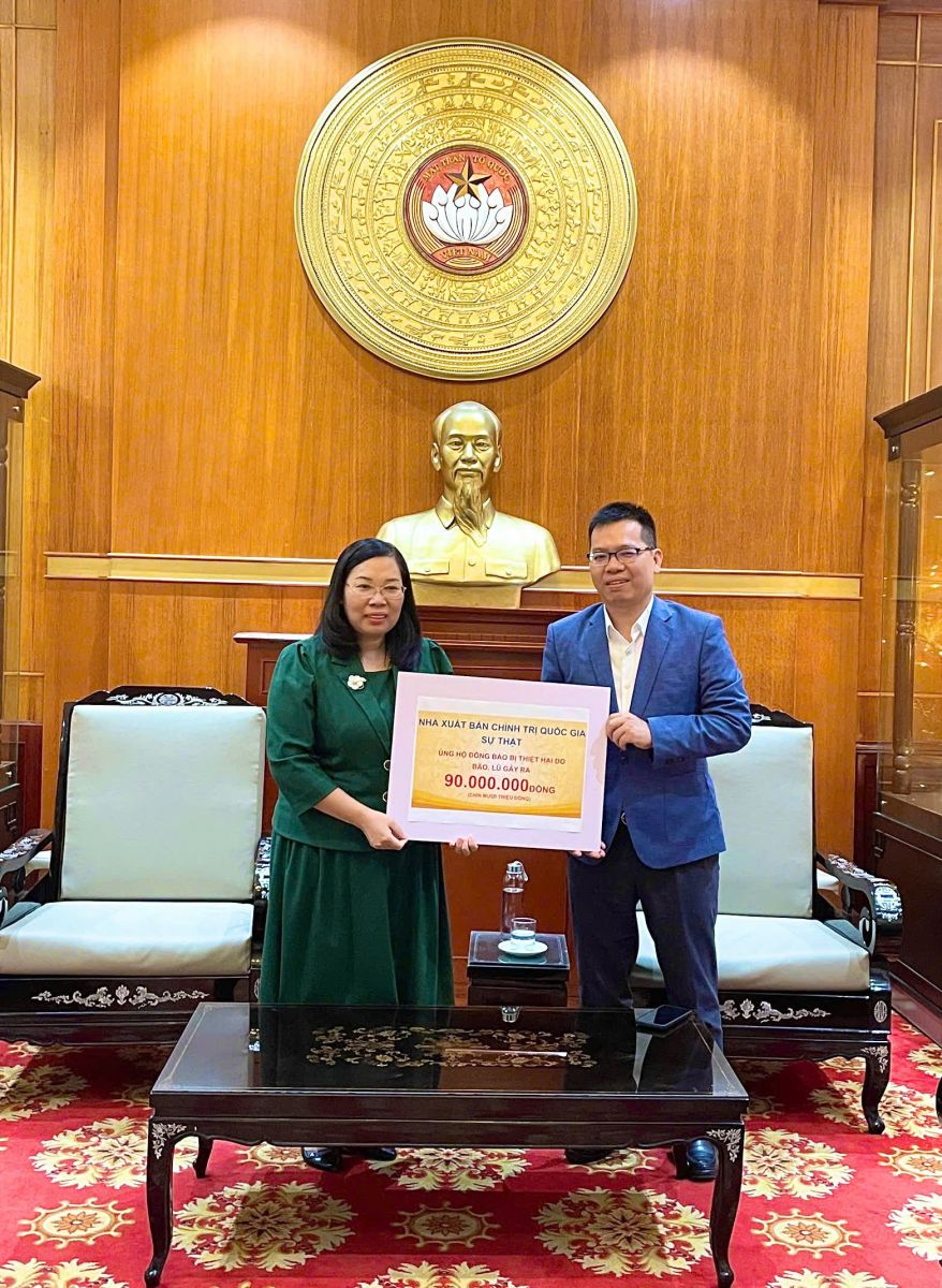 Trao số tiền ủng hộ của tập thể cán bộ, viên chức, người lao động Nhà xuất bản Chính trị quốc gia Sự thật tới đơn vị tiếp nhận là Trung ương Mặt trận Tổ quốc Việt Nam để gửi giúp đồng bào khắc phục hậu quả do bão lụt gây ra, đồng chí Phạm Thị Thinh, Phó Giám đốc - Phó Tổng Biên tập cho biết, để giúp đồng bào ta vượt qua khó khăn, sớm ổn định cuộc sống, với truyền thống đạo lý của dân tộc Việt Nam, đoàn kết, tương thân tương ái, với tinh thần “nhường cơm sẻ áo”, ngày 24/11 vừa qua, Nhà xuất bản đã tổ chức phát động kêu gọi toàn thể cán bộ, viên chức, người lao động Nhà xuất bản chung tay ủng hộ đồng bào các tỉnh khu vực miền Trung, Tây Nguyên. Hưởng ứng lời kêu gọi, cán bộ, viên chức, người lao động Nhà xuất bản đã tích cực, tự nguyện quyên góp, mỗi người ủng hộ ít nhất một ngày lương, thể hiện tấm lòng, sự quan tâm và tình cảm chân thành hướng về đồng bào đang phải chịu thiệt hại nặng nề do bão lũ gây ra.