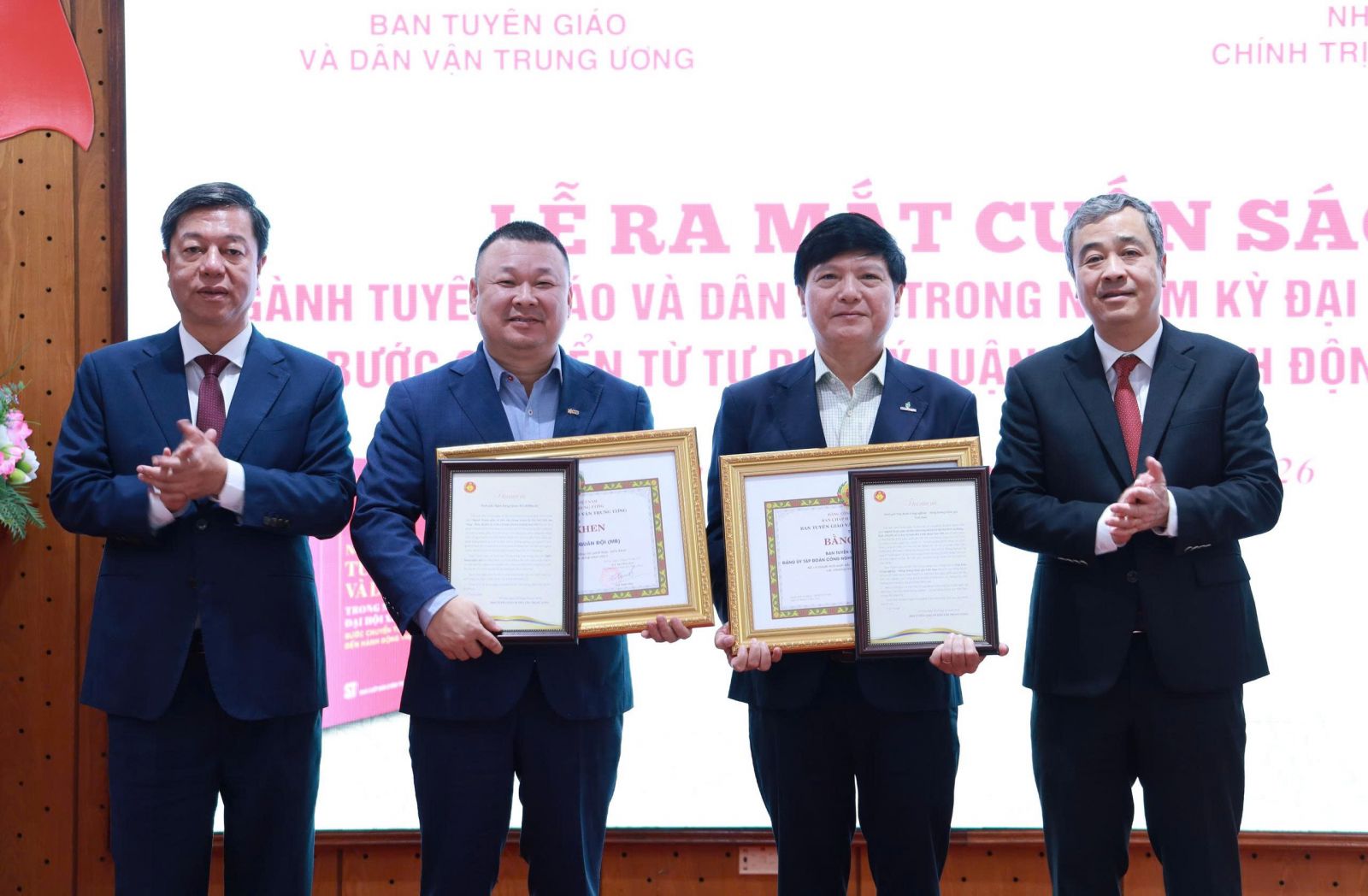 Đồng chí Ngô Đông Hải trao tặng Bằng khen của Ban Tuyên giáo và Dân vận Trung ương cho các đơn vị đã có thành tích xuất sắc trong công tác phối hợp, triển khai các chương trình, hoạt động năm 2025 và đồng chí Vũ Trọng Lâm trao Thư cảm ơn các đơn vị đã đồng hành, tích cực hỗ trợ để cuốn sách hoàn thành, ra mắt bạn đọc.