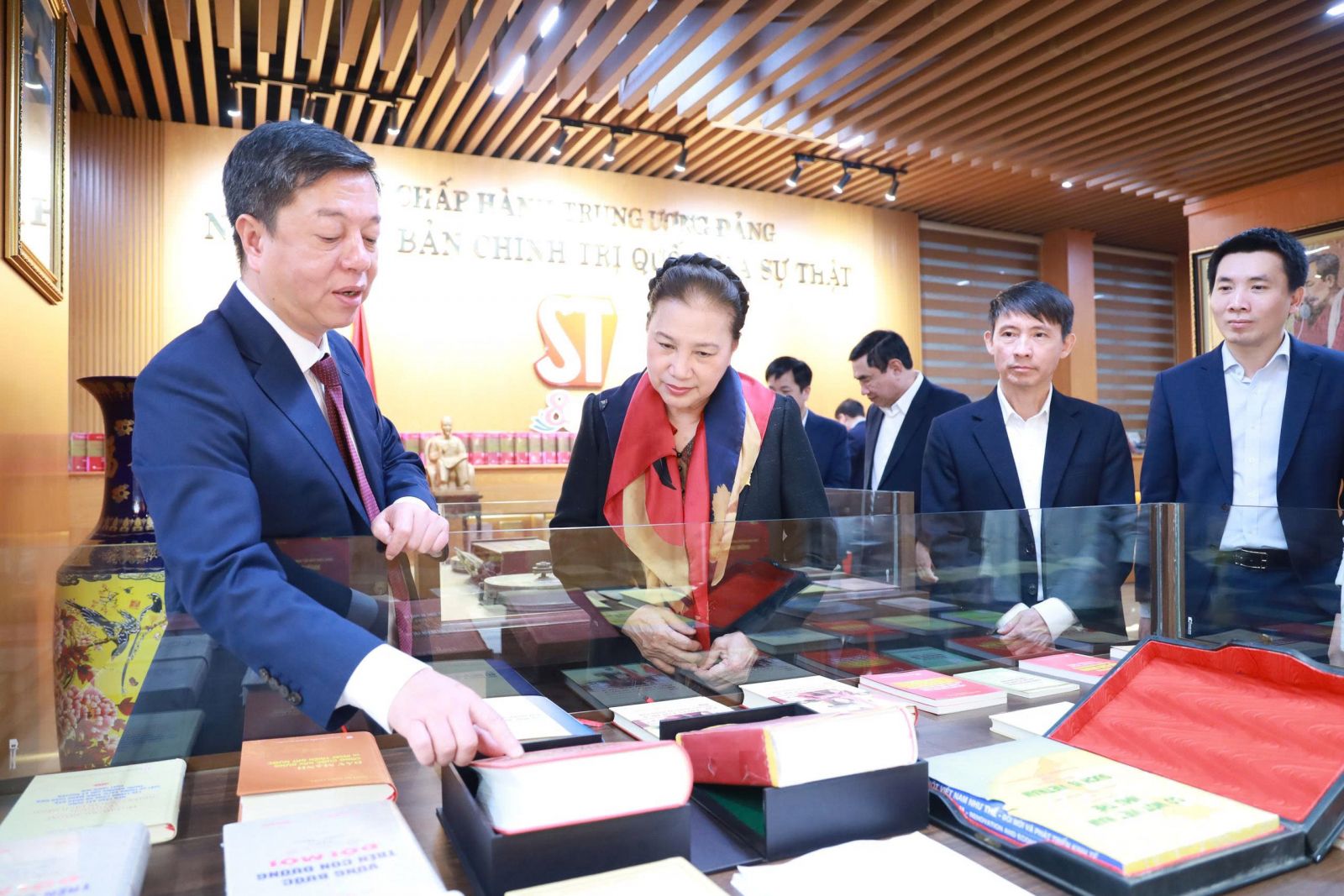 PGS.TS. Vũ Trọng Lâm giới thiệu với nguyên Chủ tịch Quốc hội Nguyễn Thị Kim Ngân các ấn phẩm của Nhà xuất bản tại không gian trưng bày sách của Nhà xuất bản.